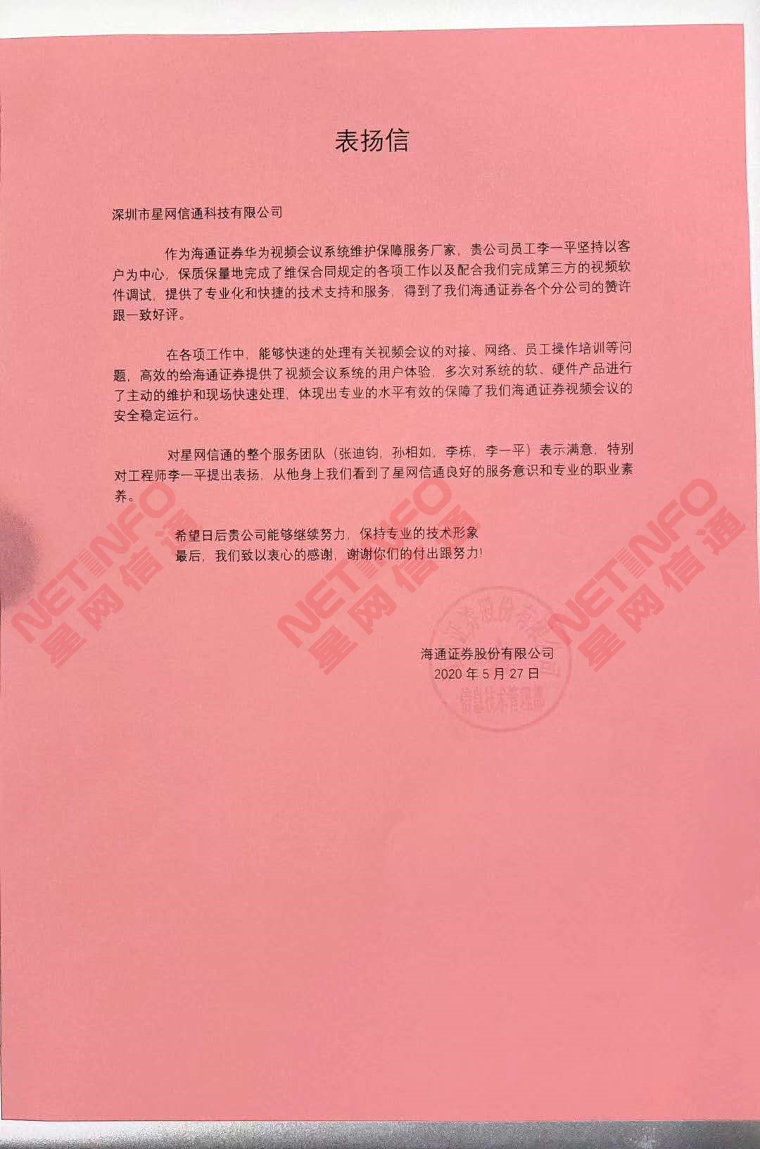 我司2020年承接的海通證券股份有限公司--華為視頻會議系統維護保障服務項目,在項目維護過程中,項目組成員體現了極強的專業素養,克服了種種困難,圓滿提前完成了任務,獲得了客戶極高的評價和認可。客戶的滿意是星網信通存在的最大價值,我們感謝海通證券股份有限公司對我司工作的認可,并會再接再厲,以專業態度服務 用真誠感動客戶!